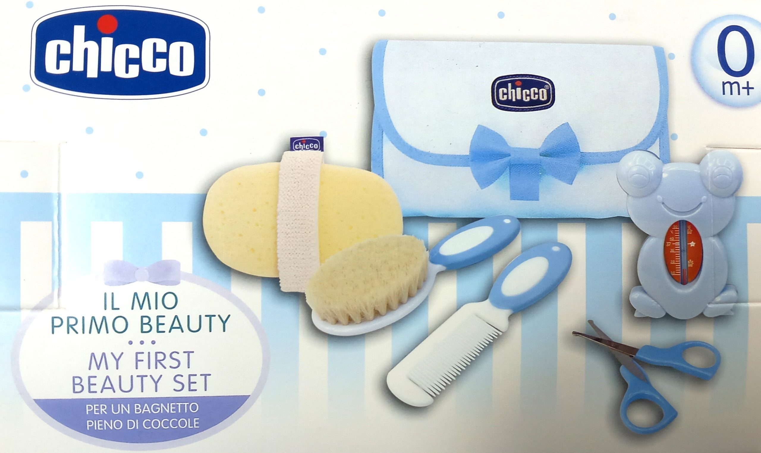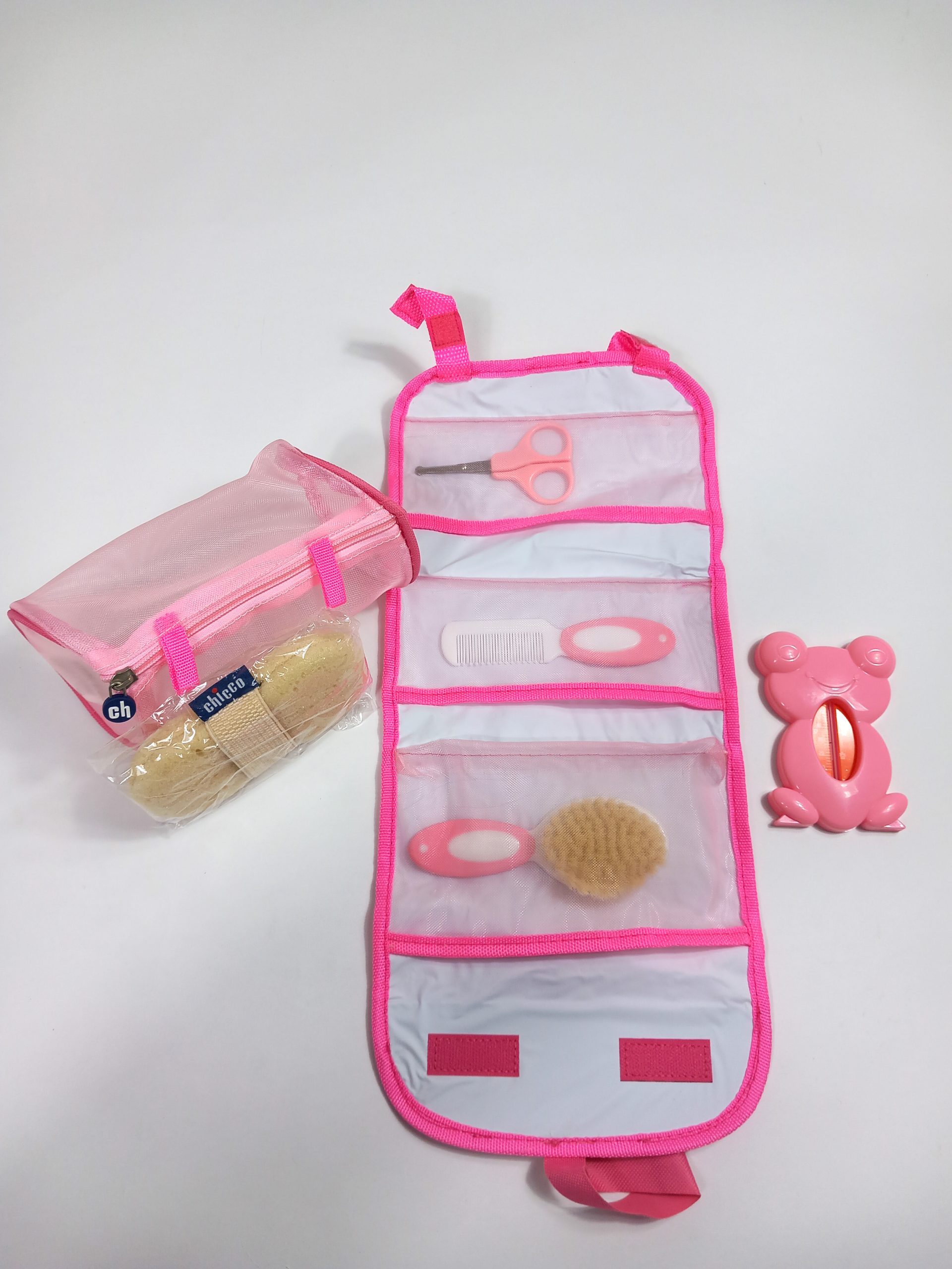 Les kits hygiène-bain de Chicco réunissent tous les produits indispensables à la toilette de bébé : un peigne, une brosse aux poils doux, un indicateur de température à bande thermique pour le bain de bébé, une éponge naturelle et une paire de ciseaux. Le tout dans une élégante pochette avec rangements qui se transporte facilement et qui peut être accrochée dans la salle de bain ou dans la chambre de bébé.
