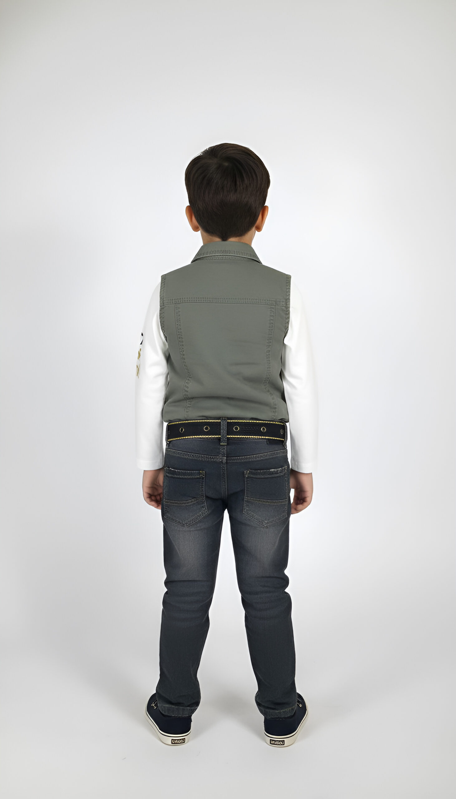 L’ensemble est une jolie pièce de bonne qualité et confortable à votre petit chouchou, qui se compose d’un Gillet sans manche, un t-shirt imprimé LONG BEACH CALIFORNIA et un pantalon jean avec ceinture.