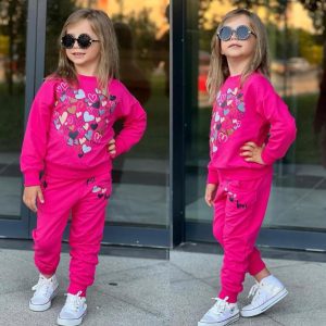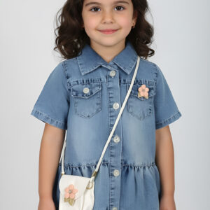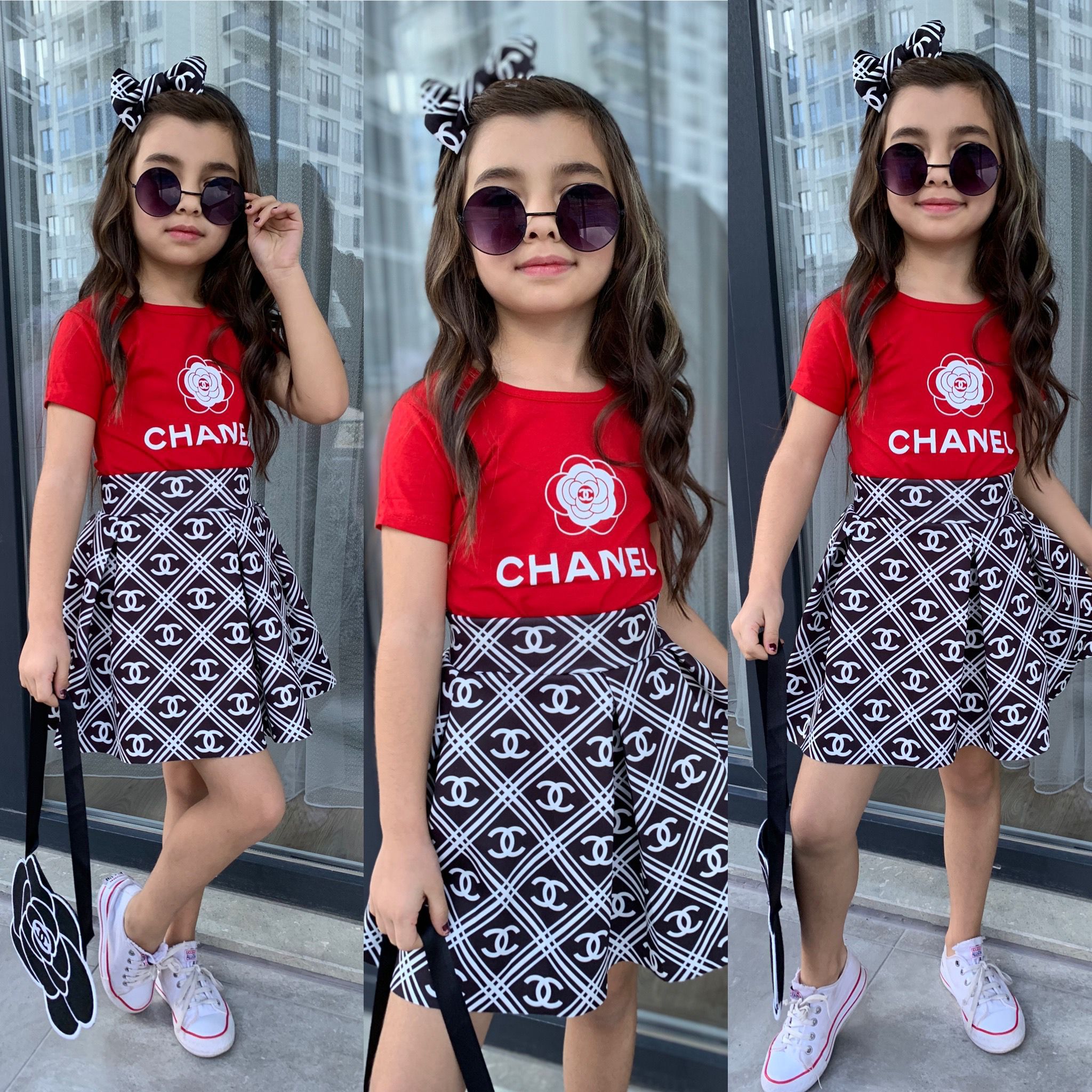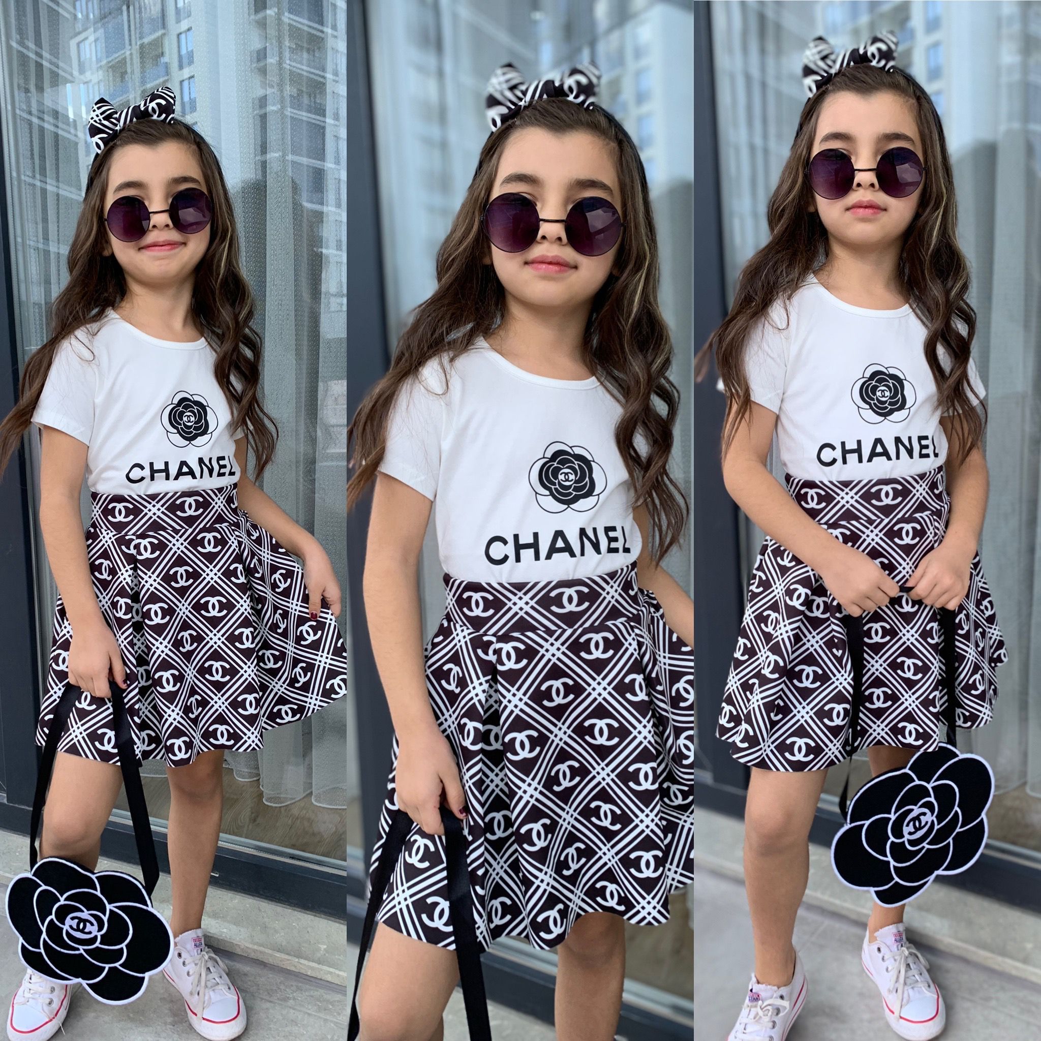 Chouette, une petite tenue complète ! Un ensemble pratique et craquant avec t-shirt imprimé chanel et une jolie jupe évasée accompagné d’un sac mignon en forme de fleur et un serre-tête avec papillon pour embellir les cheveux de votre princesse.